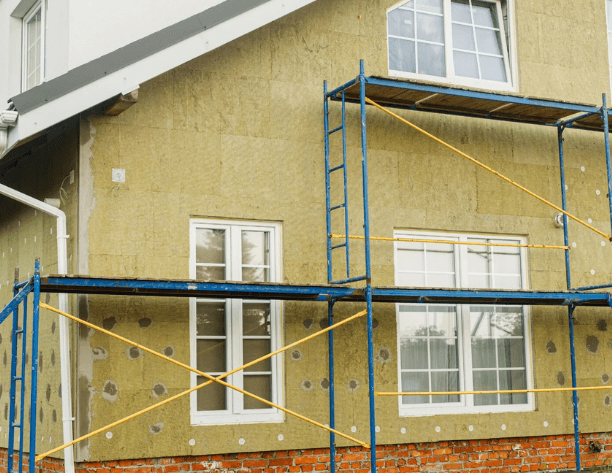 - Montáž lešenia: Pre bezpečný prístup a prácu na fasáde je potrebné postaviť lešenie.