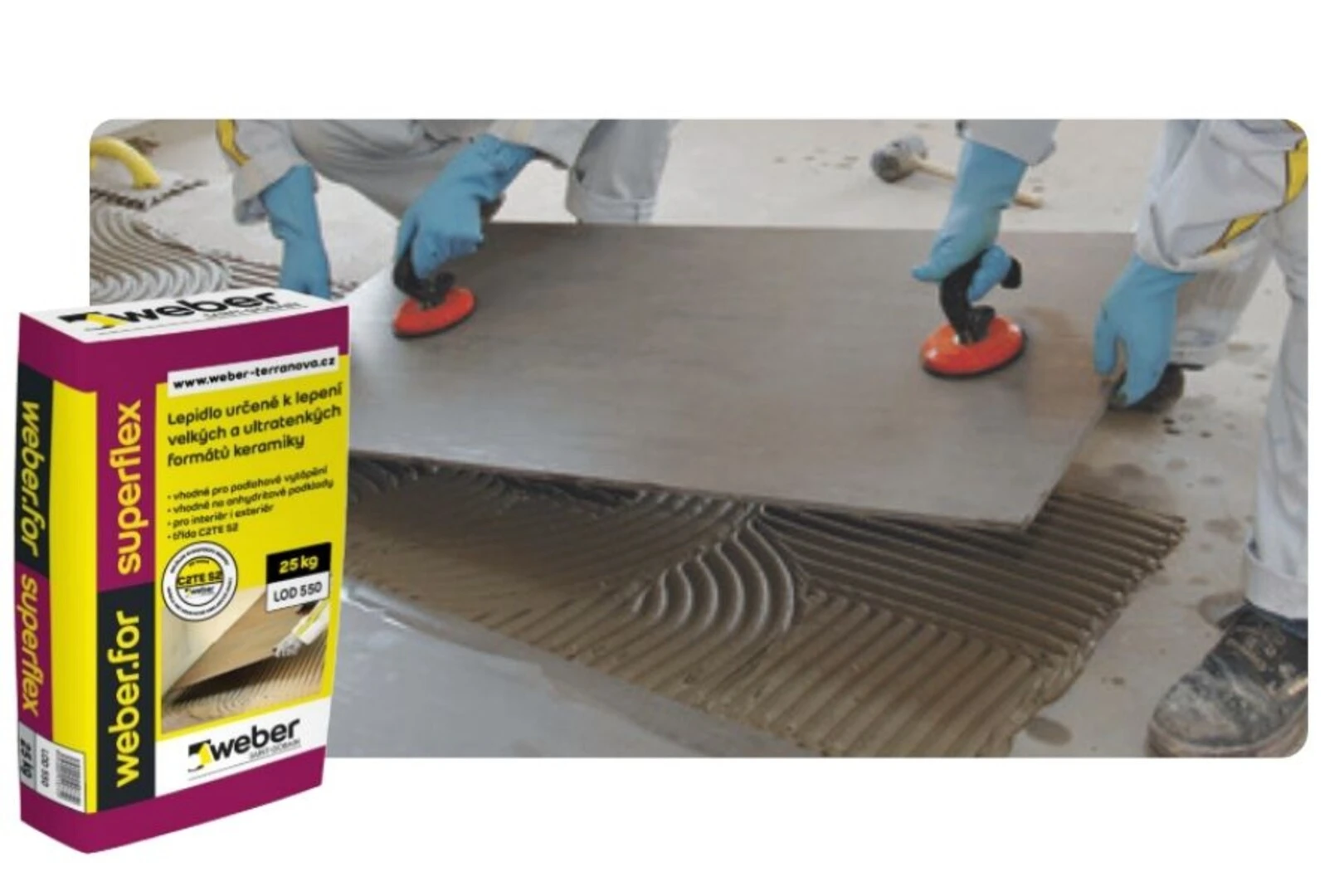 - Na lepenie dlaždíc väčších rozmerov slinutých dlaždíc, ultratenké keramiky a obkladov z umelého kameňa